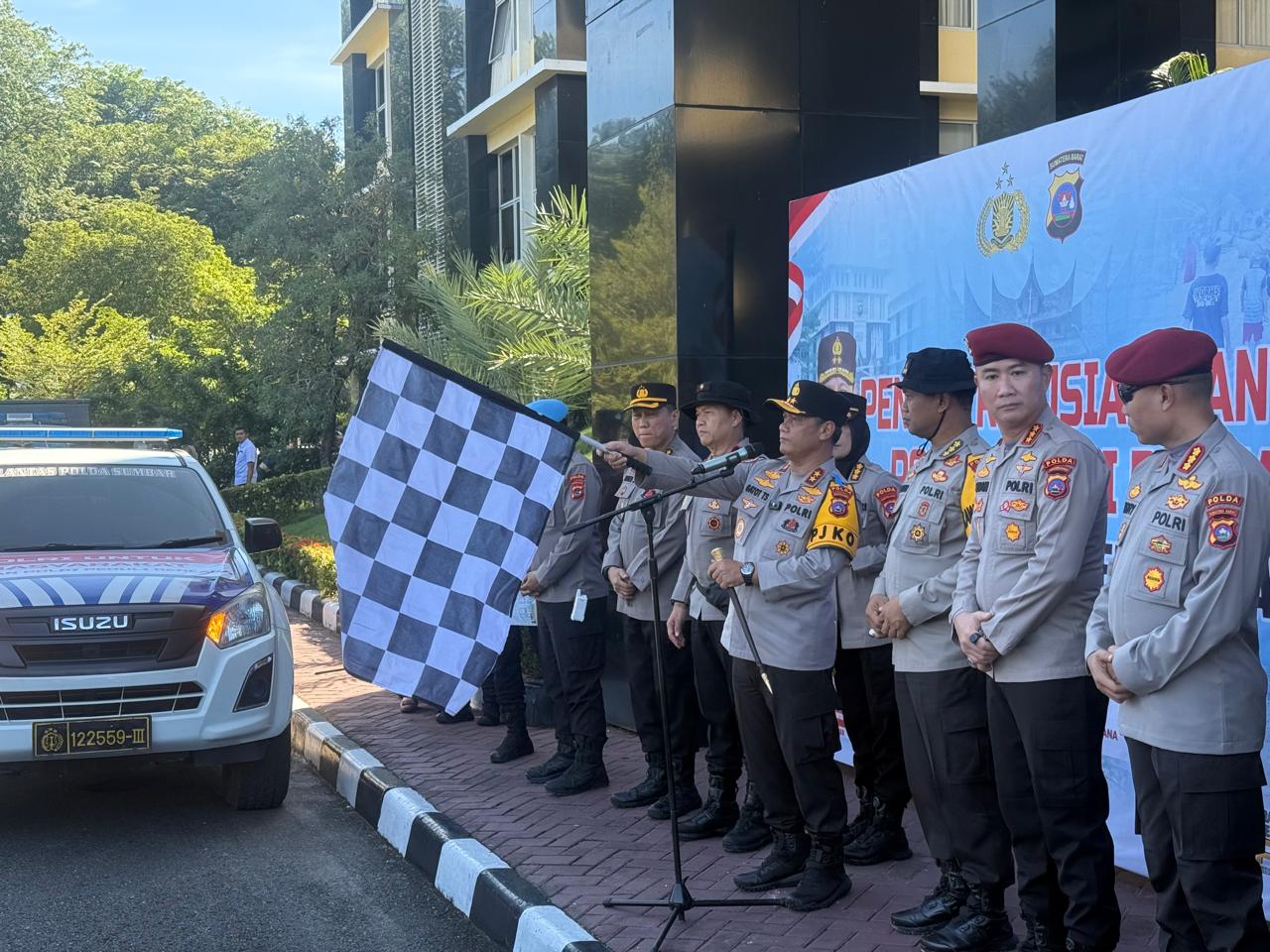 SUMBAROPINI – Kapolda Sumbar Irjen Pol Gatot Tri Suryanta secara resmi melepas keberangkatan bantuan kemanusiaan dari Mabes Polri dalam sebuah apel yang digelar di halaman Mapolda Sumbar, Sabtu (29/11/2025).